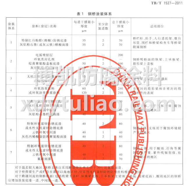 TB/T 1527-2011鐵路鋼橋保護(hù)涂裝及涂料供貨條件-表1鋼橋涂裝體系
